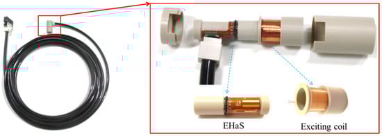 According to the diameter of the control rods, EHaS probes were designed with an inner diameter of 10.2 mm and an outer diameter of 22.0 mm. Each EHaS probe has 16 Hall sensor elements arrayed around an 11.2 mm cylindrical supporter at an interval of 22.5° (2.2 mm). The bobbin coil is placed outside of the EHaS, which has 168 turns, with a width of 13 mm, using a 0.1 mm copper wire. The inner diameter of the bobbin coil is 13.8 mm. The sensor signal cable length is 10 m from the inspection stage to the signal processing units. The prototype of the EHaS probe is shown in Figure 4.