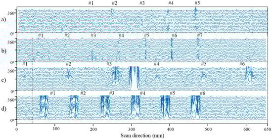 For improvement of signal quality, the signal from all Hall sensor elements is taken into account in the fusion approach, as described in Figure 8. The square rule of the differential signal is used in the wavelet filter (denoise) and weighted by their average value. The processed signal VPro of all the defects is shown in Figure 9. The defect signal was improved so that the 30% depth SW (#1 and #4), 40% depth PCC (#2), and 30% W depth FCC (#3) could be detected. The shapes of the defect were determined as follows: the signal from the SCGs was widely distributed in the axial direction and covers full (or almost) 360°; the signal from the SWs was concentrated in a group, and the signal from the CCs was shortly distributed in the axial direction. The results show that all the SCGs and SWs were detected. However, the small depth CCs could not be observed clearly. For instance, the 30% depth FCC (Figure 9b) looks like a PCC; this could be a variant lift-off during the scan.