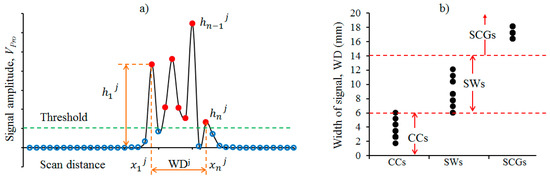 For quantitative evaluation of the defect shape and size, two factors are extracted: the amplitude of the signal (h) and the width of the defect signal (WD), as described in Figure 10a. Here, h is the average of all the signal amplitudes in the defect area, which is above the threshold, and WD is the average of all the distances between the first (x1) and last (xn) signal, which is above the threshold. h and WD are expressed in Equation (6) and (7), respectively, where, s is the scan step (1.724 mm) and n is the number of data above the threshold. By using the WD, the shape of the defect can be distinguished, as shown in Figure 10b.