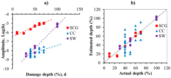 Evaluation of defect depth: (a) relationship between signal amplitude with defect depth and (b) estimation of depth results.