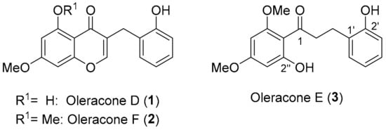Recently, oleracones, a novel series of flavonoids, were isolated from Portulaca oleracea L. by Chinese researchers [,]. They reported the potent antioxidative potential of oleracones, which allowed us to speculate that oleracones may also possess anti-aging properties [,]. The current paper includes the concise sequential synthesis of oleracones and an evaluation of their possible lifespan-extension properties using Caenorhabditis elegans, an excellent experimental model to study aging. Among the reported oleracones, we planned to synthesize two homoisoflavones, oleracones D (1) and F (2), and a dihydrochalcone, olereacone E (3), which exhibit potent antioxidative effects (Figure 1).