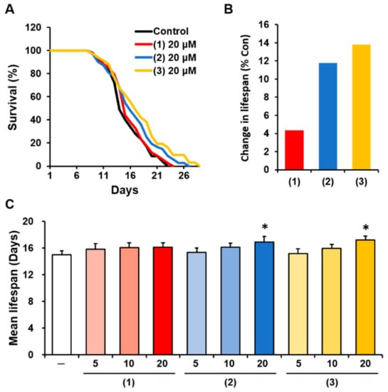 With the oleracones D–F (1–3) in hand, we examined their effects on the longevity of nematodes. To test whether oleracones exhibit lifespan-extension activity, we performed a lifespan assay using wild-type N2 nematodes at 20 °C, as described previously []. As shown in Figure 2A,B, all of the oleracones tested could prolong the lifespan of the nematodes under standard culture conditions, although the effectiveness of each compound was somewhat variable. At the maximum concentration studied (20 μM), treatment with 3 and 2 extended the lifespan of nematodes by 13.8 and 11.8%, respectively, compared with the control, while the efficacy of 1 (4.3% extension) was inferior to that of 2 and 3. Interestingly, the longevity effect of 1–3 on nematodes did not show any correlation with their radical scavenging activities (IC50 values: 11.73, 13.17, and 17.78 μM, respectively) [,]. These results suggest the possibility that modulating aging-related factors may also cooperate with the direct radical scavenging activity that produces the anti-aging effect. However, detailed information on the underlying mechanism of the lifespan-extension properties of oleracone 1–3 remains to be defined.