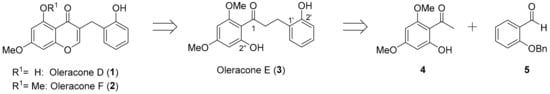 The retrosynthetic analysis for oleracones is outlined in Scheme 1. Homoisoflavone skeleton was anticipated to be efficiently prepared via a deoxybenzoin route, one of the most popular synthetic methods used for the preparation of isoflavonoids []. Therefore, homoisoflavone 2 and its O-demethylated analog 1 were planned to be obtained from dihydrochalcone 3. Oleracone E (3) was anticipated to be prepared via an aldol condensation between commercially available 4,6-dimethoxy-2-hydroxybenzophenone 4 and 2-(benzyloxy)benzaldehyde 5.
