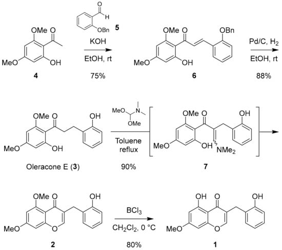 Our synthesis was commenced with an aldol condensation between commercially available 4,6-dimethoxy-2-hydroxybenzophenone 4 and 2-(benzyloxy)benzaldehyde 5 to give chalcone 6 (Scheme 2). Concurrent hydrogenation and hydrogenolysis of the O-benzyl group in chalcone 6 using 5% activated Pd on carbon under H2 atmosphere led to olereacone E (3) in 88% yield.
