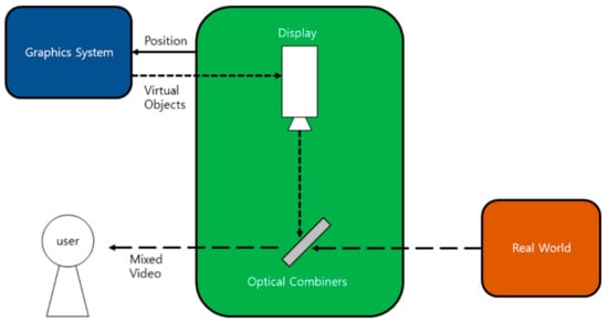 At this time, a marker-based AR for recognizing a marker through a camera or a non-marker recognition AR using a camera and a sensor outputs a virtual object to the optical synthesizing lens, after processing through the device’s graphics system. The video see-through system is a method of acquiring real-world information by using one or more cameras as shown in Figure 3, synthesizing the information with the virtual information using the graphic system, and transmitting the information through the display. Most video see-through systems have the advantage of high-quality resolution and wide viewing angle, because they depend on the performance of the connected computer, not the stand-alone system. However, because of the way the camera displays information, there is a high probability of causing 3D nausea. On the other hand, most optical see-through systems are stand-alone devices with their built-in computer, which is specialized in portability and activity.