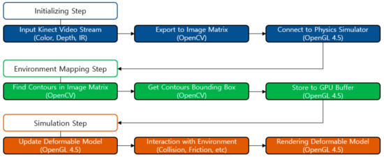 Our system is divided into the initialization step → environment mapping step → simulation step sequence. In the initialization step, Kinect’s video stream (color, depth, IR) is input for the augmented reality environment configuration. The received color and depth images have different resolutions, making it difficult to estimate the information in the environment mapping stage. To do this, the color and depth streams are calibrated in the initialization step. Then, each image is composed of an image matrix for each frame, and is connected to the physics simulator. The connected image matrix is used as a background for the augmented reality environment. In the environment mapping step, we use OpenCV, an image processing library, to extract meaningful information for interaction between the augmented object and the real world. First, in the step, all rectangles are found in the matched frame-specific image matrix. The rectangle is stored in the GPU buffer in the form of an Axis Aligned Bounding Box (AABB), which is one of the bounding boxes for smooth collision handling. After the initialization step and environment mapping step are performed, object characteristics are set, and then the real-time simulation is performed, and interaction with the collision point of the detected real environment is performed.