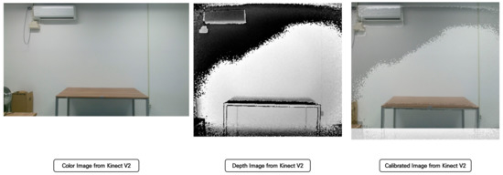 The image input through the color camera has a resolution of (1920 × 1080), but the image input through the depth sensor has a resolution of (512 × 424). We performed image calibration through the following algorithm for the analysis of two different images. The following Table 1 and Figure 6 show the image calibration algorithm and the result of our method: