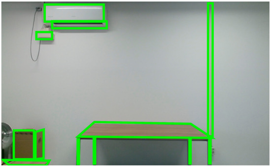 We derived the Calibrated Image Matrix from the matching algorithm, and analyzed the image of the matrix to extract meaningful information. Significant information, such as a desk or wall that can interact with the enhanced object, was detected in this study. The contours detection method provided by the image processing library OpenCV was used to detect (x, y) coordinates and (z) coordinates in the color image matrix, and to group them into one bounding box form. The information was then stored in the GPU buffer of the physics simulator to interact with the augmented object. Figure 7 shows the results of detecting squares using image processing from a video frame.