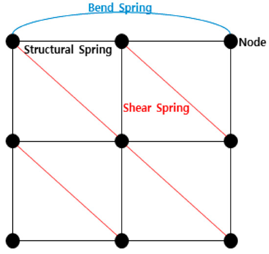 The MSS has the structure shown in Figure 9, in a way that the object is constituted by a point (node) having a mass and an imaginary line (spring) connecting it. When constructing a cloth model, all spring structures are used, but when constructing a volume model, only a structural spring is used.