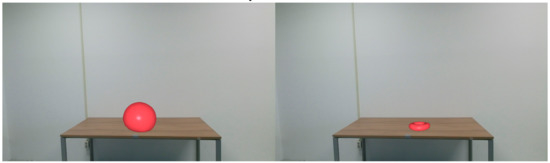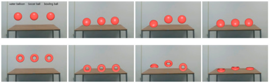 We applied a water balloon, soccer ball, and bowling ball material to the sphere model by adjusting the material properties of each object. As a result of performing scene 1, we can see that the result of the simulation changes when different material properties are applied. The results of experiment 2 confirm that the deformation and the behavior of the object are different when different external forces are applied to the object having the same material properties. We applied external forces to the top of each of the three balls, and we compared the ball bouncing off the invisible wall. In the case of a stronger external force, the simulation was performed at high speed and the deformation was greater. Each snapshot in Figure 12 was taken every 1000 frames.