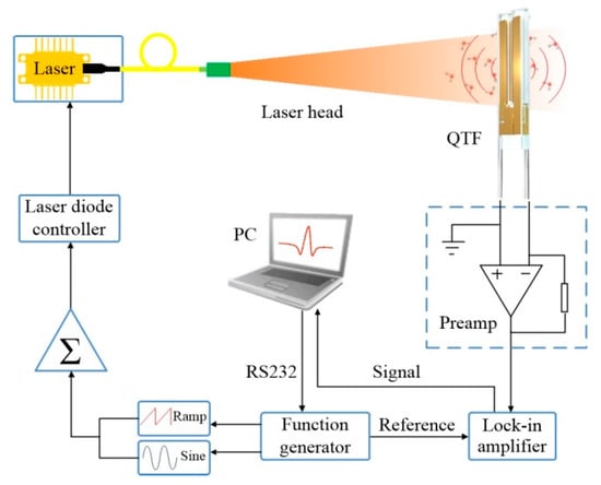 - Patimisco, P.; Sampaolo, A.; Bidaux, Y.; Bismuto, A.; Scott, M.; Jiang, J.; Muller, A.; Faist, J.; Tittel, F.K.; Spagnolo, V. Purely wavelength-and amplitude-modulated quartz-enhanced photoacoustic spectroscopy. Opt. Express 2016, 24, 25943–25954. [Google Scholar] [CrossRef] [PubMed]