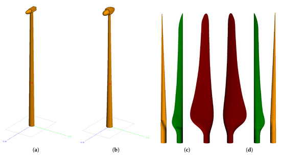 CAD models of the investigated wind-turbine components, with increasing complexity: (a) WT v1: tower, nacelle, and hub; (b) WT v2: tower, nacelle, and hub; (c) blades: bottom; and (d) blades: top.