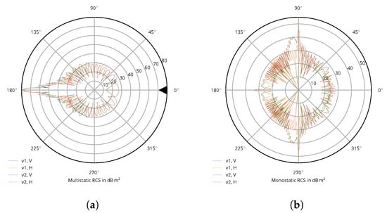 Figure 2b shows the monostatic RCS of the ensemble of tower, nacelle, and rotor hub. As can be seen, there are distinctive differences to the sides (at 90 and 270). WT v1 causes a very strong single peak, which is not as pronounced with WT v2. WT v2 in turn displays a spread of stronger echoes to directions further backwards. This is caused by WT v1’s simple box shape, which also causes a strong peak at 180 compared to WT v2’s rounded teardrop-like shape. Polarization is different, too. While WT v1 shows little polarization dependence if at all, with WT v2, the H polarization shows oscillations in the front hemisphere which are not present in the V polarization.