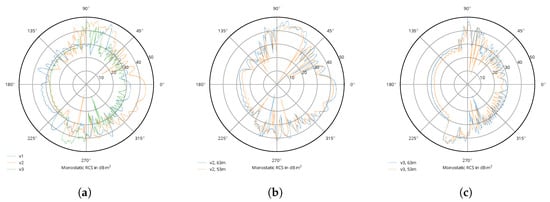 In Figure 3a, the rotor blades in their default configuration, modelled with PEC material, are presented. As can be seen, common characteristics are hard to make out. There is usually a stronger signal return at the leading edge: upwards between 50–90 and downwards between 230–260. Blade v1 features strong peaks at 70 and 235, while blade v2 shows those at 80 and 350 and blade v3 shows those at 90 and 245. Polarization sensitivity is low overall.