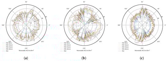 The same, unfortunately, cannot be stated for FRP. While the PEC models do not exhibit polarization dependence, the FRP models do, sometimes significantly (see, e.g., Figure 4b). Furthermore, the sandwich structure common in lightweight construction cannot be omitted from the simulations as the layered structure causes interference, both constructive or destructive, depending on the angle of incidence. Simulations with dielectric losses considered showed no significant change. This makes finding a baseline “upper bound”/worst-case estimate for the RCS infeasible. It is to be assumed that features present in the FRP simulations but not in the PEC models are subject to change as more details of the internal structure (e.g., spar and trimming elements) are added. This might be alleviated in the future, as CRP is currently gaining market share in all domains of lightweight construction.