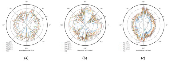 Figure 4 shows the different blade’s RCS, with FRP, assumed to be lossless, in different thicknesses, and the PEC simulation (see Figure 3a) as reference. The thickness was varied from 5–20 in 5-mm steps [44]. Larger values of up to 10 cm are reported in References [45,46], which are considered for the multilayered panels presented below. A common feature is the increase of signal return with thickness increase. For blades v1 (Figure 4a) and v3 (Figure 4c), the signal return with FRP is only rarely greater than with PEC, although differences between the polarizations are clearly visible. However, blade v2 in Figure 4b shows significant differences depending on polarization: the H polarization shows an entirely new backside lobe at 135–200, which is just as strong as the main front lobe at 350. Introducing dielectric losses with a loss tangent introduces only minimal changes, as shown in Figure 5.