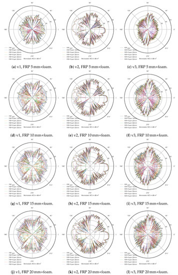 The panel in Figure 6 shows a parameter study where a layer of foam () of varying thickness (5–20 in 5-mm steps) was placed below FRP of varying thickness (10–50 in 10-mm steps). From row to row downwards, the thickness of the FRP increases by 5 . The trend towards higher RCS with thicker FRP is also present here. As above, blade V2 shows significant differences depending on polarization. The RCS of the dual-layer model is only rarely larger than that of the single-layer FRP model, with the differences never larger than 3 .