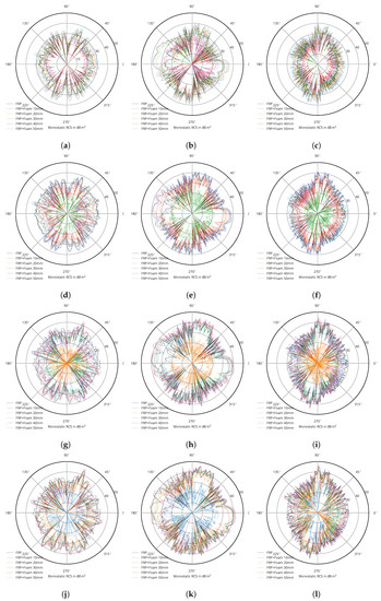 Monstatic RCS (in ) of the rotor blades (left to right) composed of a sandwich setup of FRP, foam, FRP, with variable thicknesses. (a) v1, FRP 5 mm, foam, FRP 5 mm; (b) v2, FRP 5 mm, foam, FRP 5 mm; (c) v3, FRP 5 mm, foam, FRP 5 mm; (d) v1, FRP 10 mm, foam, FRP 10 mm; (e) v2, FRP 10 mm, foam, FRP 10 mm; (f) v3, FRP 10 mm, foam, FRP 10 mm; (g) v1, FRP 15 mm, foam, FRP 15 mm; (h) v2, FRP 15 mm, foam, FRP 15 mm; (i) v3, FRP 15 mm, foam, FRP 15 mm; (j) v1, FRP 20 mm, foam, FRP 20 mm; (k) v2, FRP 20 mm, foam, FRP 20 mm; and (l) v3, FRP 20 mm, foam, FRP 20 mm.