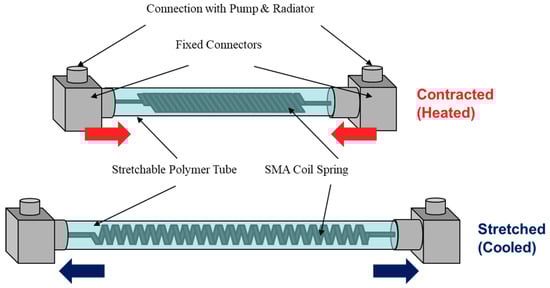 The highly stretchable muscle-like actuator proposed in this work is designed based on SMA coil springs and coolant circuit for a thin, high force, displacement, and fast response. Figure 1 shows the schematic design of the proposed actuator. In order to make the actuator thin, one SMA coil spring is integrated with a coolant circulation system. An electrical wire is connected to both the ends of the SMA coil spring while attaching it tightly at the end of a Polycarbonate connector containing the coolant flow inlet and outlet. The temperature of the SMA increases when the electrical current is applied to the SMA as the SMA itself is resistance. A stretchable polymer tube that is designed to surround the SMA coil spring is used for the flow of coolant. The polymer tube is made with Ecoflex 00-30 (Smooth on Co). It stretches and contracts in conjunction with the SMA coil spring thanks to its high stretchability of over 300% of its initial length. The tubes attach to the pump and the radiator was connected to the other end of the connectors. The coolant flows in closed circulation. The initial diameter of the stretchable polymer tube before stretching is selected as 7 mm. The width and height of the connectors are less than 15 mm. Mineral oil is chosen as a coolant that flows inside the tube.