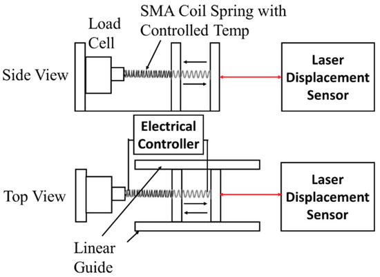 The experimental setup for the force-displacement relationship measurement of the spring samples is shown in Figure 3. The temperature of the SMA was measured by the thermocouple and was kept constant by feedback control. For the samples that have transition temperatures of 40 °C, the temperature was controlled at 30, 40, 50, 60 and 70 °C. For the samples that have transition temperature of 70 °C, the temperature was controlled at 30, 50, 70 and 90 °C.
