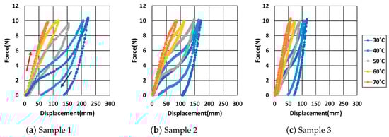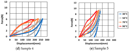 The graphs of the relationship between force and displacement of the sample springs at various temperatures are shown in Figure 4. Several characteristics of SMA can be observed in all the experimental results. As the temperature increases, the spring force in the same displacement increased as well. In addition, residual strains occur at low temperature as the crystalline arrangement of the SMA was converted from twinned martensite to detwinned martensite phase.