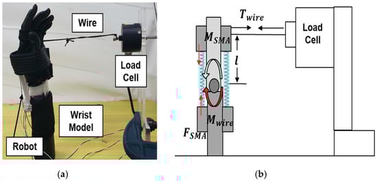 The torques of the four wrist motions were measured to observe the performance of the SWA. The experimental setup is shown in Figure 9. The robot was worn on a 3D-printed hand-forearm model, in which the hand and the forearm were connected via a universal joint. The universal joint was used since it had two non-aligned axes, similar functions to that shown in a real wrist joint. The maximum torque was measured when the wrist was in its neutral position. One end of a steel wire was connected to the wearable robot, and the other end of the wire was connected to a load cell that measured the tension in the wire. The torque was estimated by multiplying the distance between the universal joint and the wire by the tension [45]. The simple equation for the estimation of the torque is described in Equation (2).