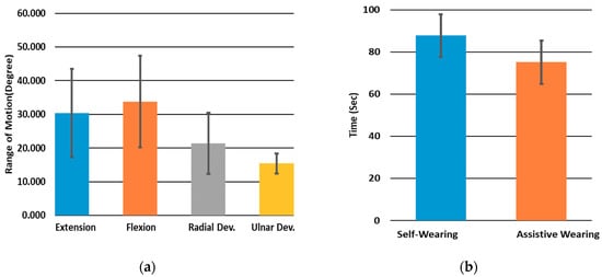Figure 10b shows the measured average wearing times of two experiments. The average time spent on self-wearing was measured as 87 s. The average assistive wearing time was measured at 75 s. The step that consumed the most time was inserting fingers into the glove in both experiments. The fact that it takes less than 2 min to wear the robot indicates that the proposed robot system can be worn easily. In particular, the experimental result of the self-wearing implies that the proposed robot can be worn solely by the patient with only one hand in about 80 to 90 s. Therefore, the patients facing motor impairments in their wrist can also wear the robot without the need for external assistance.