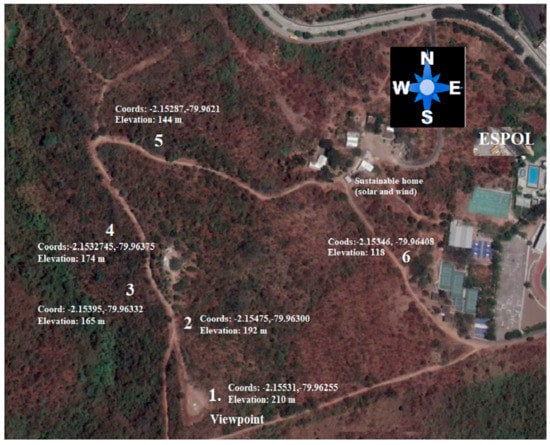 From this analysis, 6 places were considered as suitable for the installation of autonomous stations. Subsequently, the environmental diagnosis, soil study and a more exhaustive study of the flora and fauna of the place were made. Of the 4 points along the trail, one was eliminated because the presence of a teak forest, deciduous trees that generated too much shade to obtain an important irradiation intensity [10]. Another point was removed due to the presence of a “CEIBO” tree that could generate too much shadow. This point was moved down hill to a location where there appeared to be no obstacles for solar radiation. Following the procedures indicated, irradiation measures were performed at the 4 end points of the trail, as well as at the viewpoint.