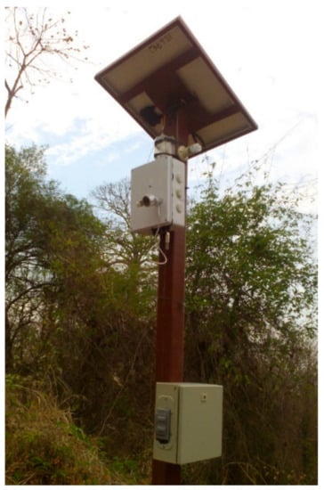 From the literary review, several authors present studies indicating that energy can be guaranteed, if the number of photovoltaic modules and the orientation of the greenhouse are correctly chosen for the latitude and the time of year [31], and the location of the modules is important when looking at reducing the shadow effects that can generate large energy losses [32]. Even, they have been made flexible panels to supply energy to autonomous systems and to replace the shading elements, thus achieving normal crop development [33,34]. These studies show results of uses of photovoltaic panels to energize greenhouse ventilation systems (use of 3 to 4 photovoltaic panels, regular, inverter, battery) and research involving a detailed analysis of the operation of the photovoltaic panel. For our case, it is the same principle and components for energizing an audio and video system. In general, there is little information from studies submitted where results of the operation of photovoltaic facilities in forests are installed and analyzed for the acquisition and recording of the fauna information of the site.