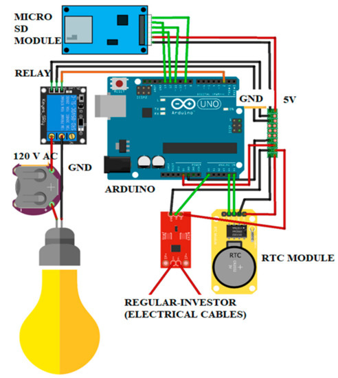 On the other hand, in the case of night lighting, the program made using Arduino has the option to easily change the interval at which you want to illuminate the autonomous stations, the date of the watch is also set in case the battery is spent. All Arduino modules used (microSD, Relee and PSTN) and current sensor use for their 5 V operation which are provided by the Arduino UNO 5 V output from its internal voltage regulator. In the Arduino an expansion module (Shield) was placed to weld the cables of the different sensors and make the connections to 5 V and ground (GND) described above, moreover the device is powered by the inverter via USB connection.