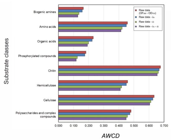 For a more detailed analysis, the carbon substrates can eventually be divided into eight classes of compounds (polysaccharides and complex compounds, cellulose, hemicellulose, chitin, phosphorylated compounds, organic acids, amino acids and biogenic amines) and the AWCD and diversity indices calculated for each group separately (see examples in References [4,5] and in Figure 1).