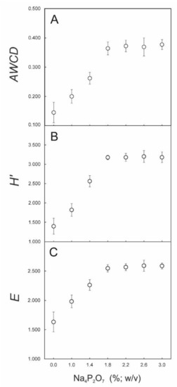 On the same soil samples (10−5 dilution, reading at 96 h, subtraction of both blank well and blank-corrected OD readings) and on the basis of previous experiments [7,9], eight concentrations of Na4P2O7 • 10 H2O ranging from 0.0% to 3.0% (w/v) (0, 0.6, 1.0, 1.4, 1.8, 2.2, 2.6 and 3.0%) were used for finding the optimal concentration to be used. Due to its high number of electric charges once in solution, it is known that this compound has the ability to disperse charged soil colloids. This is particularly important for soil microbiological assays, as bacteria are not only present on the surface of soil aggregates but also inside the aggregates, that is, on the micropore and macropore walls and in their internal spaces [6]. Figure 3 shows that with more than 1.8% (w/v) Na4P2O7 soils did not show an increase in AWCD, H’ and E, probably because the maximum possible number of bacteria was extracted from soil. Of course, this value could vary for different soil types but we can suggest that a concentration of around 2.0% (w/v) is necessary for not underestimating AWCD values. The use of the appropriate concentration of Na4P2O7 allows to overcome the technical problem in extracting the highest number of microorganisms from soil samples, that was one of the main remarks of this technique highlighted by Preston-Mafham et al. [10].