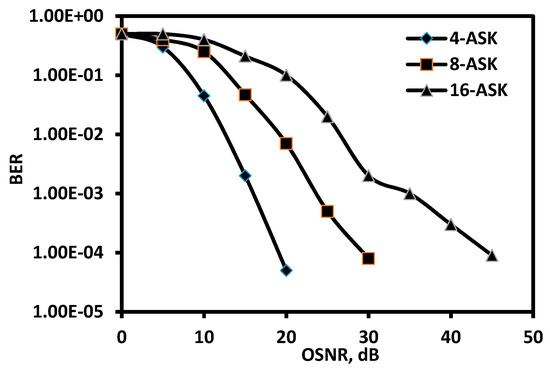 In Figure 1, the optical Fast-OFDM modem performance over an AGWN channel is illustrated in terms of optical signal-to-noise ratio (OSNR) at 0.1 nm without using any form of nonlinear equalization. In Figure 1, the DAC/ADC clipping noise (or ratio) and quantization bits were isolated to investigate the true impact of OSNR on the developed optical Fast-OFDM modem. From Figure 1, it is noticed that for a fixed bit-error-rate (BER) value, a higher order modulation format needs higher OSNR. More specifically, the OSNR is required for achieving a BER of 10−3 when using 4-ASK is 18.5 dB, 25.5 dB for 8-ASK, and 36 dB for 16-ASK. It should be noted that simulated results agree very well with the analytical results reported in [6], which confirms the validity of the used model.