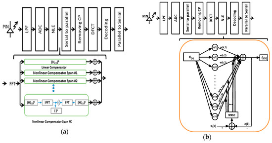 - Giacoumidis, E.; Mhatli, S.; Nguyen, T.; Le, S.; Aldaya, I.; Ellis, A.; Mccarthy, M.; Eggleton, B. Comparison of DSP-based nonlinear equalizers for intra-channel nonlinearity compensation in coherent optical OFDM. Opt. Lett. 2016, 41, 2509–2512. [Google Scholar] [CrossRef]