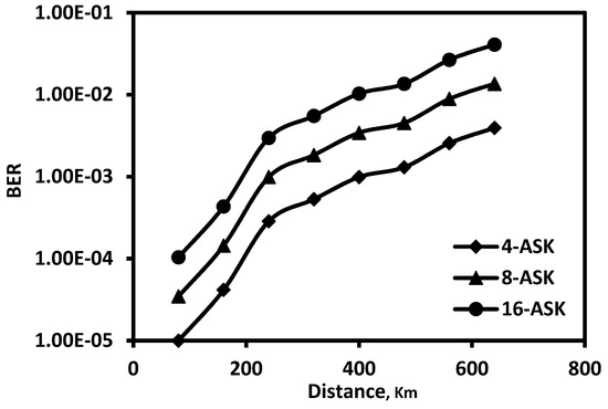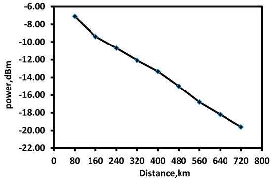 Figure 6 depicts the received optical power at the PIN versus the transition distance while adopting the 4-ASK modulation format; it is worth noting that the optical received power values are different at different fiber lengths, varying from −7 dBm for 80 km to −18 dBm for 560 km.