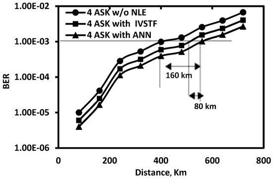 The capability of ANN for nonlinearity compensation in optical Fast-OFDM with intensity-modulation and direct-detection is illustrated in Figure 4 in terms of BER vs. distance. In Figure 4, a 4-ASK modulation was considered for simplicity at a signal capacity of 9.69-Gb/s. The optimum transmitted power was found at −6 dBm for ANN-NLE, as well for the benchmark IVSTF and without (W/O) using NLE (i.e., considering only linear equalization). It is revealed from Figure 4 that 160 km extension in transmission-reach is achieved by ANN compared to linear equalization for the adopted BER threshold. In the same manner, 80 km extension in transmission-reach is observed when using ANN compared to the Volterra-based NLE. The latter can be explained by the fact that while IVSTF compensates deterministic intra-channel nonlinearities, ANN can tackle both deterministic and stochastic nonlinearities, i.e., parametric noise amplification from concatenated EDFAs and the interplay between nonlinearity and polarization-mode-dispersion.