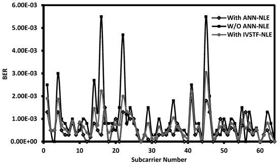 On the other hand, the performance difference between ANN and linear equalization can be explained in Figure 5, where the BER distribution on the sub-carrier index is depicted. The figure essentially shows that a few Fast-OFDM sub-carriers under ANN equalization have decreased BER (corresponding to increased SNR) compared to linear equalization. This happens because ANN can reduce the effects of inter-carrier four-wave mixing.