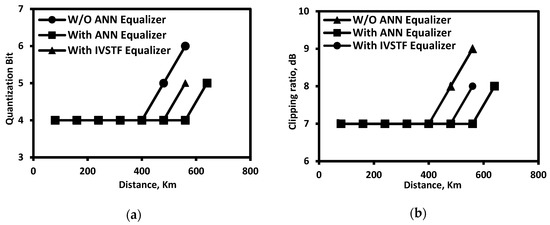 Figure 7a shows the effect of the IVSTF and ANN equalizer on the optimum quantization bit. As it can be seen from this figure, utilizing the ANN equalizer relaxes the requirement of a high-resolution DAC/ADC, and reduces the requirement of high quantization bits by 2-bits for the same transmission distance (for the case of 580 km) when compared with case of without equalizer, and by 1 bit when compared with the case of utilizing the IVSTF equalizer. Similarly, this is also applied for the case of clipping ratio, as depicted in Figure 7b: using the established ANN equalizer, an increase in the transmission distance is observed when utilizing the optimum clipping ratio (7 dB); while for a fixed distance of 580 km, a 2-dB reduction in the required clipping ratio is observed when using ANN compared W/O ANN, moreover a reduction of 1 dB when compared with the IVSTF equalizer case.