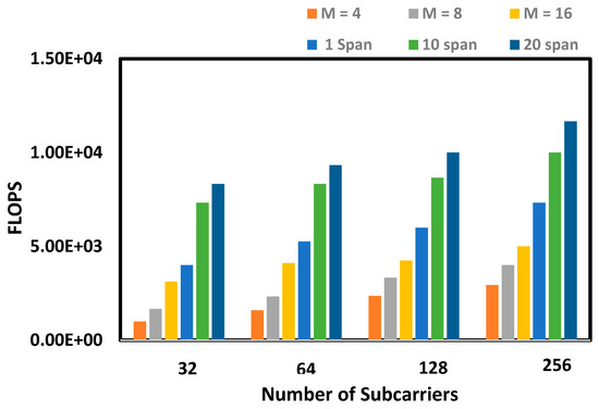 Below, Figure 8 illustrates a comparison between ANN-NLE and IVSTF-NLE in terms of subcarriers versus Floating points Operations (FLOPs). As the ANN-NLE is a modulation format dependent, therefore, different modulation formats M-ASK (M = 4, 8, and 16) has been used, moreover for the case of number of spans dependent IVSTF-NLE, the modulation formats has been set to 4 ASK, thereafter the number of span has been changed as follow 1 span, 10 spans, and 20 spans.