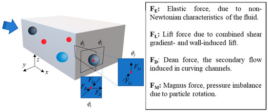 Most of the in vivo and in vitro studies have been carried out at a bulk-level. Although these techniques bring invaluable critical insights into various fields, including biology and medicine, they usually lack single-cell resolution features to recognize cell heterogeneities associated with diseases. For studying rare cell events and the intermediate extracellular signaling, through which cells communicate, analysis tools with the micro-level resolution are of significant importance. Microfluidics chips offer new approaches for cell assays and have also been used for studying of cell biology by providing platforms for manipulating, separating, sorting, filtering, trapping, and detecting tiny biological particles based on cellular heterogeneity. They can simulate small-scale fluid flow and chemical gradients and offer full manual control over the particles to study the desired details, e.g., for food market, clinical, pharmaceutical, and other applications [1,2,3,4,5,6,7]. Precise manipulations such as focusing, separation, and fractionation of cells is a vital capability of microfluidics which can be achieved by engineering hydrodynamics forces based on unique physical attributes of cells such as size [8,9], density [9,10], deformability [11,12,13], and morphology [14] using variety of methods such as crossflow filtration [15], electrode arrays [16], optical force switching [17] and other methods, some of which can be found in detail in the review presented in [18]. In this spirit, hydrodynamic phenomena, which carry microenvironmental physical impacts on cells, are critical in almost all physiological functions and bodily systems. Generally, microfluidic devices can sort/isolate or partition cells by active approaches with external forces from acoustics [19,20], magnetics [21,22], and electrokinetics [23], as examples, as well as by passive approaches such as cellular immobilization [24], deterministic lateral displacement [25], and hydrodynamic filtration [26]. These devices have also been extensively used and proposed to study mechanical shear stress, and cell deformability and the recent advances of these applications can be found in [27,28,29,30]. This is extremely helpful since deformability of RBCs (red blood cells) can represent a potential sign of several sicknesses [28]. Moreover, microfluidic devices have been proposed to study the possible effects of microbubbles in microvessels [28] to represent the effects of these bubbles, which can form in the blood vessels occasionally and cause possible pathological events, such as preventing the food to reach to the cells in specific regions. Also, targeted drug delivery via nanomaterials, such as carbon nanotubes, was introduced recently and significantly increased the efficacy of the drugs [31,32,33,34]. As evaluation of these particles are highly dependent on their microenvironments, finding the optimum design point is facing some difficulties [35] and microfluidic systems can offer exceptional abilities to screen the nanoparticles to resolve these difficulties [1]. Zhu et al. [36] presented an in-dept review of nanoparticle delivery steps in cellular flows and summarized several microfluidic models specialized in nanoparticle evaluations related to such investigations. Particle sorting mechanisms are required to direct the drugs to the targeted cells, and numerical methods have proved themselves to be efficient in conducting such simulations [37,38]. Microfluidic devices, generally, implement any one of the two different approaches; active approaches and passive approaches. In the latter, as opposed to former which relies on fluorescent labels or beads, a variety of techniques based on inherent differences in cellular morphology among cell groups (e.g., size, shape, compressibility, and density) are employed to sort cells. In active manipulation approaches, based on specified field, the cell array is immersed in a space wherein energy distribution results in controlled forces that move cells along desired paths. On the other hand, in passive techniques, the two predominant opposite forces, known as wall lift force, which tends to repel cells from wall, and shear gradient lift force, which is due to the curvature of the fluid parcel velocities and tends to repel cells from center, determine cell equilibrium positions in the cross section of microchannel [39]. A summary of forces exerted on cells/particles is shown in Figure 1 for passive separation technique. It is noteworthy to mention that complex hybrid approaches have recently found their ways to microfluidic devices, and have been advantageous in certain studies [40]. Note that there is another force, Saffman force, which is channel center/wall-directed lift force experienced by particles lagging/leading the fluid and it is not shown in the figure to avoid confusions.