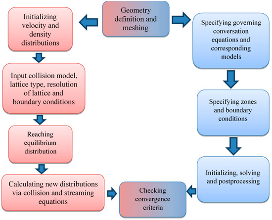 It has been shown that the solution of the Boltzmann equation can represent the NS equations at low Mach number. Having this function, one can configure the 3D flow field of the system. Among many advantages, one can mention clear physical pictures with the detailed resolution, easy implementation of intricated boundary conditions with simple mechanical rules such as bounce-back and reflection and dynamic interfaces, and fully parallel algorithms for implementing high-performance computing. Nevertheless, as a natural-born dynamic scheme, the LBM is not a method of choice for steady-state analysis; and also is not well-versed for body-fitted coordinates and adaptive time-stepping [59]. As of now, there are several open-source software such as J-lattice-Boltzmann, SunlightLB, OpenLB, LIMBES, LBSim, LB2D, LB3D, Palabos, LBM-C, Taxila LBM, and Sailfish; and commercial ones like PowerFLow, XFlow, FlowKit, LBHydra and utraFluid taking advantage of this method. A schematic and step by step comparison between LBM and conventional CFD algorithms can be seen in Figure 3 below for a better understanding of the procedure in each numerical method.