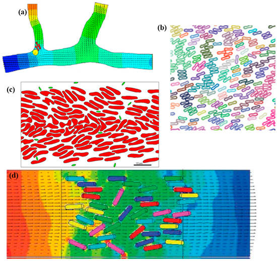 A few examples of past LBM simulations of blood cells in different domains. (a) Pressure and vector fields of three red blood cells (RBCs) flowing a white blood cell (WBC) in a blood vessel branch [65]. (b) Clusters distribution of RBCs in blood-like suspension [66]. (c) Simulation of the RBCs with platelets [67]. (d) RBCs simulated in a blood channel [68].