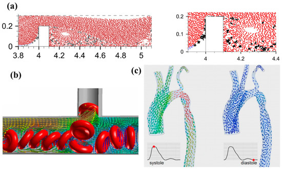Aside from advances in computational technologies, efforts have been devoted to increasing the method’s efficiency and speed and thus, reaching higher computation times and computational domains with a higher number of entities. For instance, one can mention the development of new open flow boundary conditions, which are clustered in the periodic boundary condition category. These boundary conditions still have some drawbacks for cases with so many inlets and outlets and also with time-dependent non-period flows, such as the system of the arterial network in human cardiovascular systems [95]. A few examples of results obtained from related simulations using DPD-originated methods are presented in Figure 7.