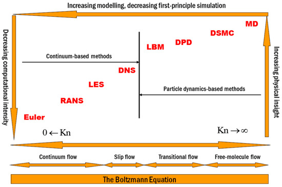 DSMC is another particle method to be used to investigate cellular flow problems. This method was introduced by [106] and is similar to MD in tracking particle properties and averaging their quantities to compute the macroscopic properties. Since the algorithm is a lot similar to that of MD, it is not schematized separately in this work. For a more detailed summary of the recent improvement, one can refer to [107]. The most important advantage of this method over MD is higher efficiency in terms of computational requirements, which makes it the preferred method in many cases because of computational tools limitation. The difference between this method and MD is in the procedure treating the interaction between the particle throughout the computational domain and this, in turn, impacts the necessary time step to ensure that the physics can be captured accurately. In MD, this time step is determined by comparing the particles’ trajectories, while in DSMC, a simplified statistical equation is used to compute this time based on some assumptions. This statistical equation makes the mathematical formulation of this method simpler to understand and implement in numerical codes, since determining the time step is independent of the geometry. However, these simplifications sometimes lead to less accuracy or not trustable results in more sensitive cases, especially in cases with larger dimensions. A practical comparison of these two methods is presented in [108]. Researchers have modified this method over time to improve its accuracy over time and presented modified versions of this method to be implemented for cellular flow problems [109].