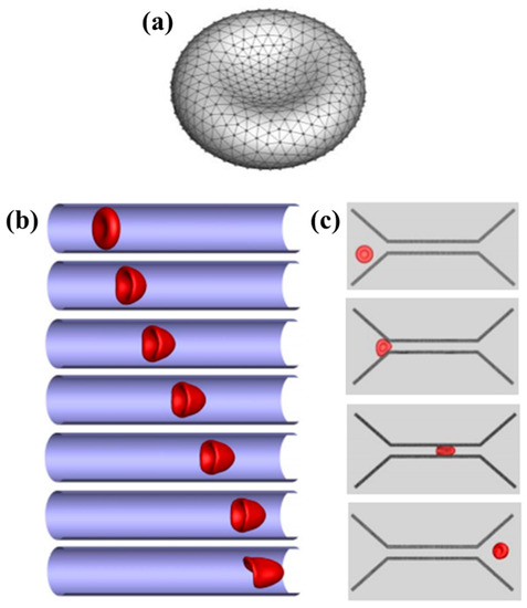 This method has been massively used in simulations of RBCs to study cell mechanical deformation behaviors under certain circumstances and/or suspension of these particles in various channel shapes representing the blood vessels to help the sorting application of microfluidic devices. A few examples of how LBM method performed in the real applications are presented in the following. Deformability of RBCs has been studied using LBM in simple channel conditions [60,61] and/or under more complex environments [62,63]. A few examples of results obtained from simulations using LBM method to simulate phenomena related to RBCs are presented in Figure 4. For a good review of such simulations in the past and more examples, one can refer to [64], where the researchers have presented results obtained from LBM simulations of RBCs-related phenomena.