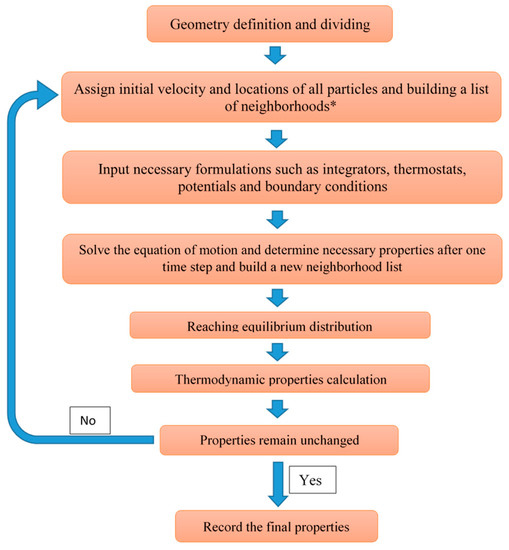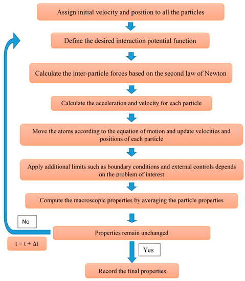 This method has offered several advantages over other conventional CFD or particle-based methods. This method is grid-free, meaning that to model a problem, equations need only to be satisfied with respect to the geometry of the domain control volume, which makes it easier to implement compared to CFD methods. This method, however needs a new grid geometry, called bins, to account for cut-off radius and to average the quantities in the domain to calculate the macroscopic values for each quantity. This advantage, its inherent high accuracy with implementing periodic boundary conditions allow simulation of flow in complex geometries, regardless of the number of particles. Moreover, equations for this method are independent of the number of particles. Thus, one can assume smaller control volumes in a big domain to speed up the process and simplify the mathematical procedure. A simplified schematic of the algorithm for the MD method is presented in Figure 9 below.