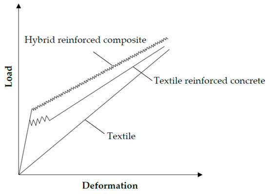 Schematic presentation of tensile load-deformation behavior of textile reinforcement, textile reinforced concrete, and hybrid reinforced composite.