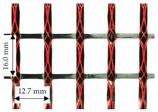 TUDALIT-BZT2 produced by V.FRAAS, Germany, was used as textile reinforcement. The spacings between warp yarns (parallel to loading direction) and weft yarns were 12.7 mm and 16.0 mm, respectively; see Figure 2. Knitted filaments connected the warp and weft yarns to form a stable structure without a rigid connection. The physical and mechanical properties of the textile yarns are given in Table 3.