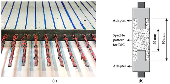 Prior to testing, the plates were cut into smaller specimens with dimensions of 90 mm × 40 mm × 20 mm, containing three warp yarns in the loading, i.e., longitudinal direction. The length of the middle gauge was 50 mm, and it covered four weft yarns. All specimens were reinforced with only one layer of textile, hence a longitudinal reinforcement ratio of 0.68% calculated based on the effective cross-sectional area of 1.8 mm2 for one warp yarn. It should be noted that usually the TRC tensile specimens have a relatively large length in order to ensure a proper textile anchorage at the specimen ends and attain yarn rupture instead of yarn pullout. However, in dynamic tension experiments, such as in the split Hopkinson bars, the length of the specimens is limited by the condition of dynamic stress equilibrium. For this reason, a length of 90 mm was adopted for the composite specimens in this investigation. To avoid premature yarn pullout after the initial cracking, the longitudinal textile yarns had protruding ends at both ends of the specimens, which were bent over the specimens’ ends and glued within the adapters by bi-component epoxy resin; see Figure 3b. The adapters were made of steel for quasi-static tension tests and aluminum for impact tension tests. In the last step, the middle, gauge portions of the specimens were sprayed to create a random black and white pattern needed for digital image correlation (DIC). All the tests were performed on the 28th day after casting.