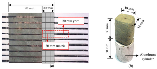 Specimen production for single-yarn pullout tests: (a) cutting configuration; (b) final specimen dimensions and fixities.